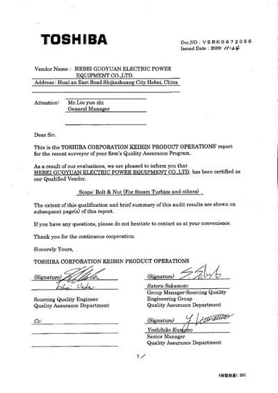 經(jīng)過日本東芝公司TOSHIBA對(duì)我公司的三次考察,順利通過認(rèn)證,特頒發(fā)合格供應(yīng)商資質(zhì)證書。